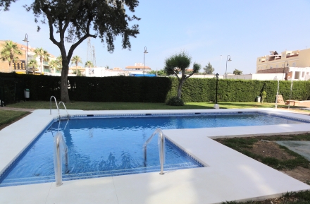 I jordplan fælles haveanlæg med nyrenoveret pool, og den nærmeste nabo er det nye store supermarked Carrefour.