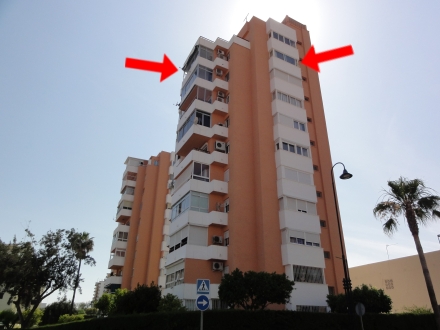 Vi er kommet op på niende sal med elevatoren. Fra den overdækkede altan er der en storslået udsigt over hele Fuengirola og i baggrunden ligger Middelhavet.