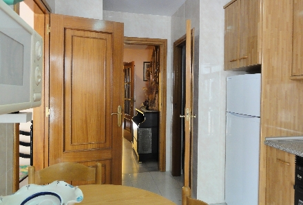 Køkkenet. Til venstre døren til spisestuen, ligefrem indblik i stuen og døren til højre er adgangen til et lille spisekammer