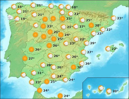 Hele Spanien får i dag ret solrigt vejr bortset fra Galicien, hvor der kan komme en smule nedbør, samt de nordlige egne og Pyrenæerne, hvor det bliver skyet, og der kan komme et par byger.