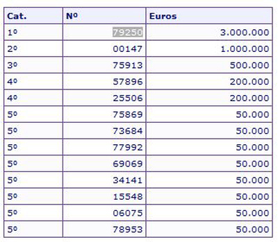 Så blev årets julelotteri 'El Gordo' afgjort. Vinder-nummeret blev 79.250, som gav en præmie på 3 millioner euro i hver af de 195 serier, som alle numrene er udstedt i.