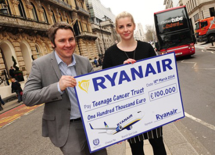 Ryanair overdrog tirsdag den store check på 100.000 euro til "Teenage Cancer Trust", som kæmper for at forbedre livskvalitet og overlevelseschancer for unge med kræft.