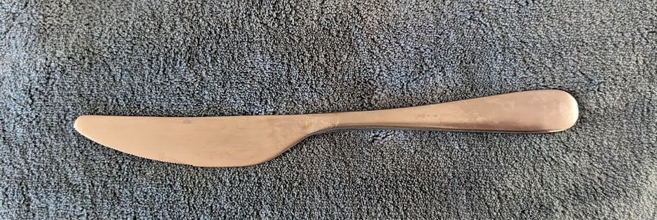 Da jeg tog ud af bordet, tabte jeg en kniv på gulvet. Satte lige tallerkenen på køkkenbordet og gik tilbage for at samle kniven op.