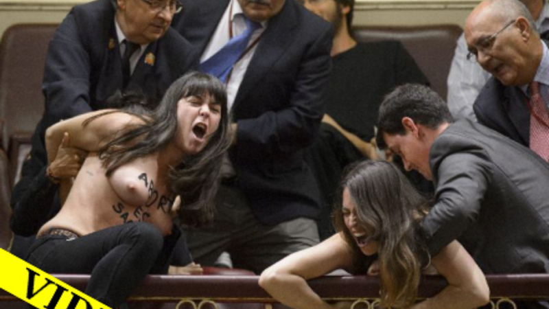 Det venstreorienterede parti Izquierda Unida gav FEMEN-demonstranterne en opbakkende klapsalve, da de blev båret skrigende ud af parlamentssalen.