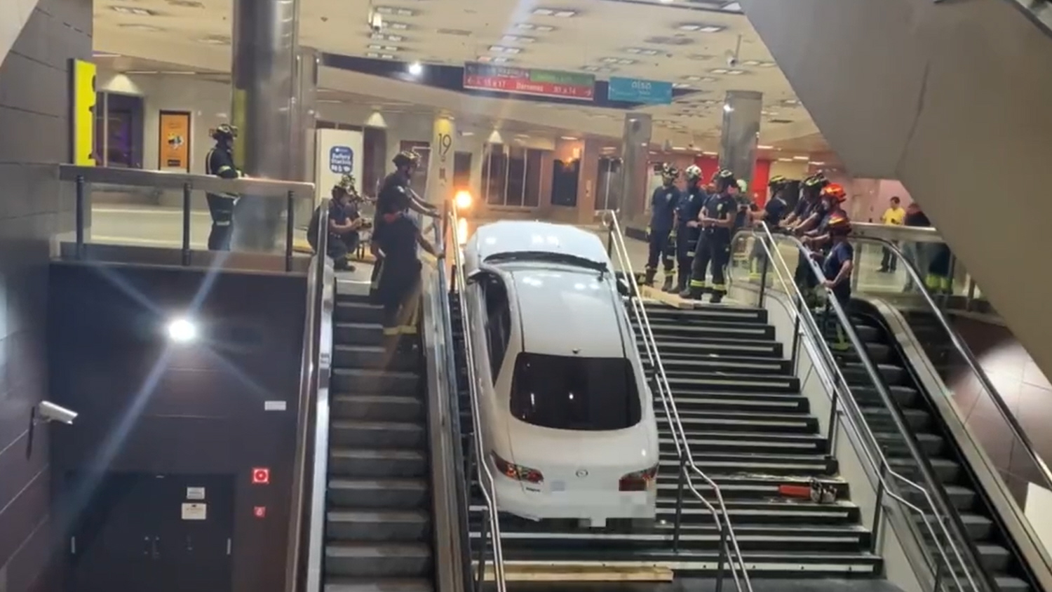 Brandvæsenet fra Madrid Kommune knoklede længe med at få fjernet bilen fra trappen: