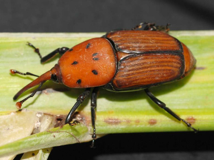Den lille røde kan blive op til fem centimeter lang og flyve over store afstande. Billens røde næb er hårdt, og det gør den i stand til at tygge sig gennem den tykke palmebark. Når først billen er kommet godt på plads, lægger hunbillerne tusindvis af æg i toppen af palmerne. Når de er klækket, spiser larverne sig gennem palmemarven, og når palmerne er invaderet af biller og laver, tørrer palmegrenene ind og tilbage står blot en nøgen palmestamme – og et dødt træ.