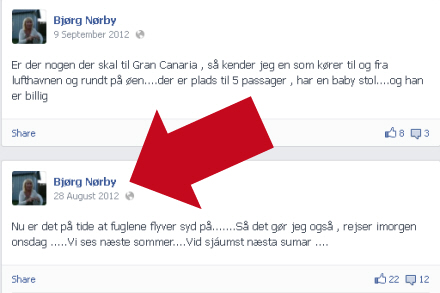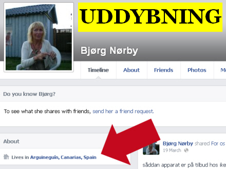 Hvis man bor fast i udlandet, bør man selvfølgelig forsikre sig – man aner jo aldrig, hvornår uheldet rammer. Og hvis Bjørg bor fast i Spanien, bør hun være dækket af et eller andet. Vi kan se på hendes Facebook, at hun allerede i slutningen af august tilsyneladende rejser til Spanien og skriver: Vi ses næste sommer. Og hun har angivet Arguineguín, Canaria, Spain som det sted, hun bor.