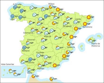 Skyet til overskyet og mulighed for regn. Sådan er vejrudsigten for det meste af Spanien i dag. Forhøjet beredskab i nordvest breder sig i morgen til store dele af de spanske kyster på grund blæst, bølger og sne.