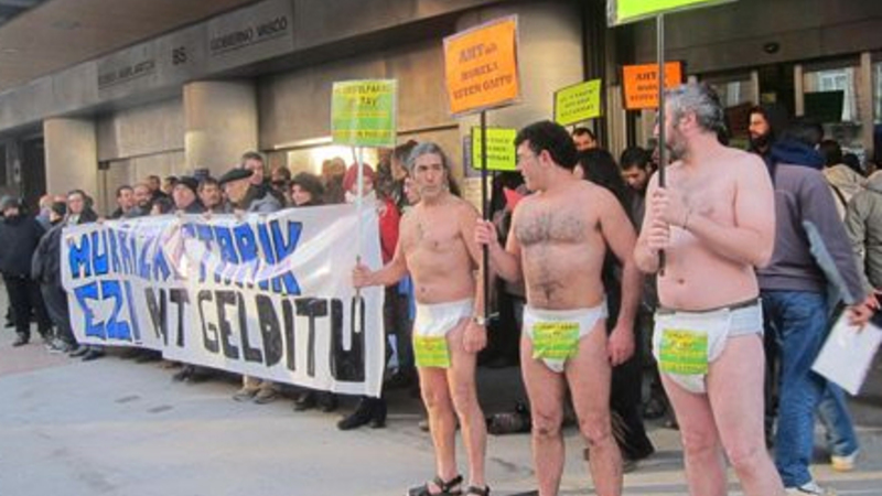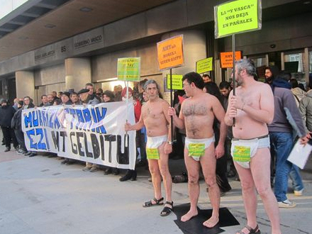 Omkring 50 demonstranter deltog i protesten, og nogle af dem var kun iført en ble. De bar et banner med teksten: 'Murrizhetariik ez. AVT gelditu'(Nedskæringer nej, stop TAV). Protesten retter sig mod fordyrelsen af projektet med anlæggelse af det nye AVE-højhastighedstog i Baskerlandet.