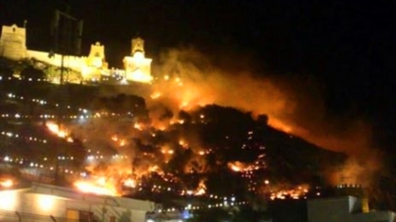 En gnist fra noget fyrværkeri antændte kort før klokken 23:30 noget knastørt krat lige udenfor borgen El Castillo i Cullera, og i løbet af få minutter stod flammerne højt.