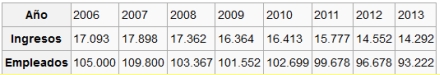 Año = år, Ingresos = indtægter, Empleados = ansatte. Kilde: Diario El País
