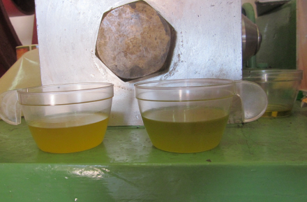 Den fineste kvalitet, jomfruolie, fås ved kold presning af frugtkødet alene. Den indeholder under 1% fri oliesyre. Normalt fjernes stenene ikke før presningen, der udføres først koldt ved lavt, senere højt tryk og til sidst varmt. Dette giver olier af aftagende kvalitet.