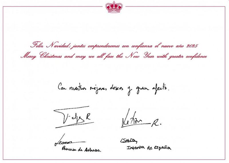Budskabet “Feliz Navidad; juntos emprenderemos con confianza el nuevo año 2025" med oversættelse til engelsk: “Merry Christmas and may we all face the New Year with greater confidence” er trykt på højre side af kortets inderside. På dansk: ”Med vores bedste ønsker og store hengivenhed for det nye år 2025”, ledsaget af underskrifter fra kongen, dronningen og deres døtre.