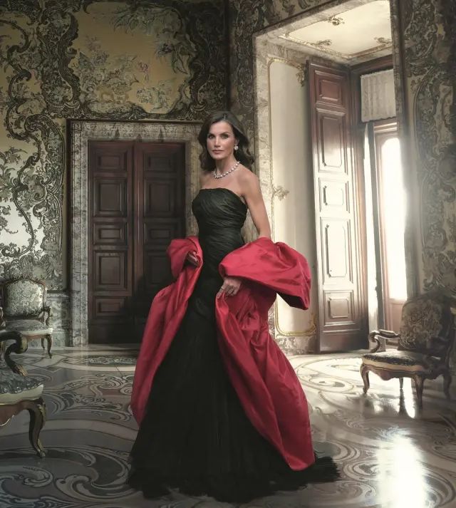 Langt fra den enkle kjole, hun bar i 2020, besluttede dronningen ved denne lejlighed at bære spansk haute couture med en spektakulær aftenkjole fra Balenciaga, som hun udtrykkeligt anmodede om fra Antoni de Montpalau Foundation, og som de udlånte til det historisk øjeblik..