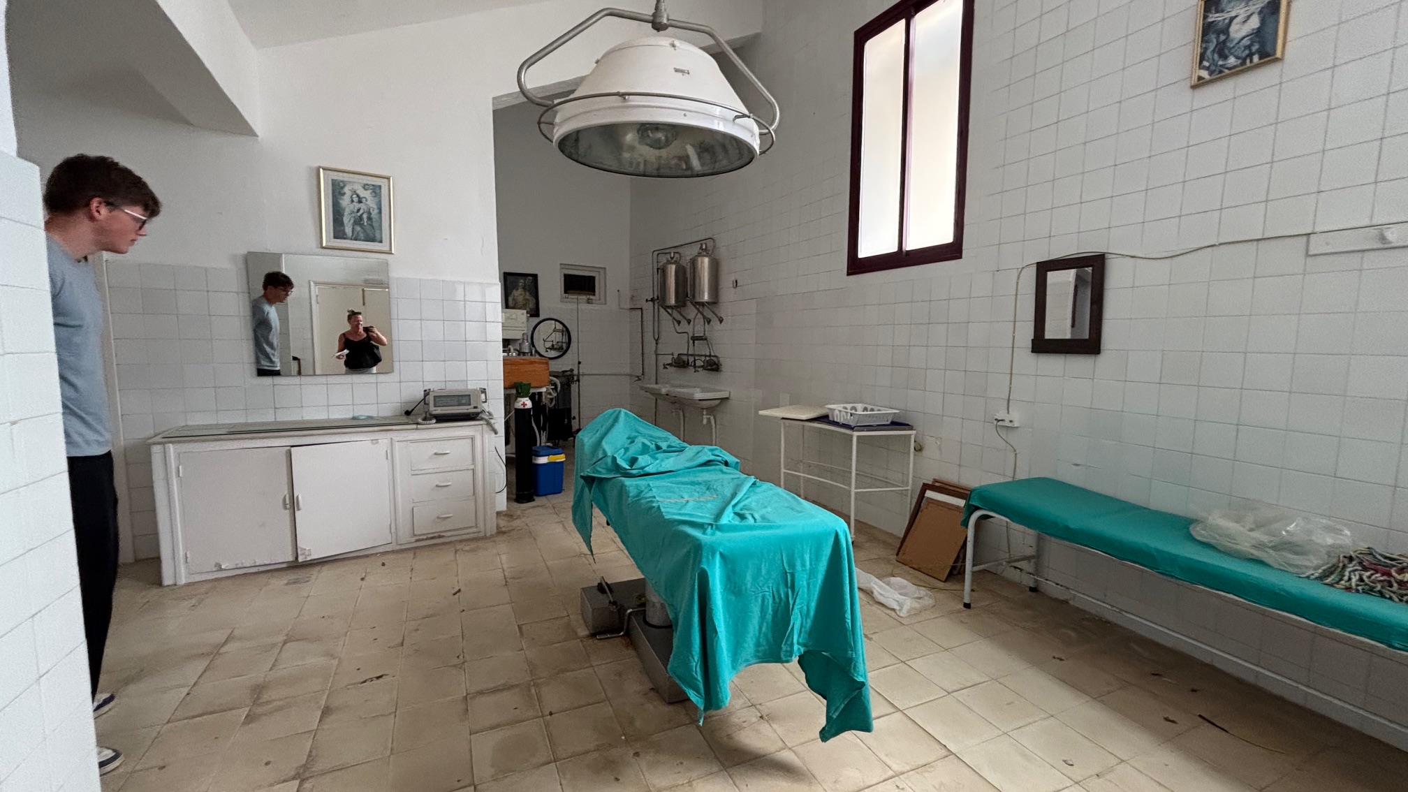 Her er briksen med det turkise operationsklæde, lampen hænger klar over den, der er medicinskabe med glaslåger, så man kan se stakke af bandager, redkaber og måske endda noget medicin?