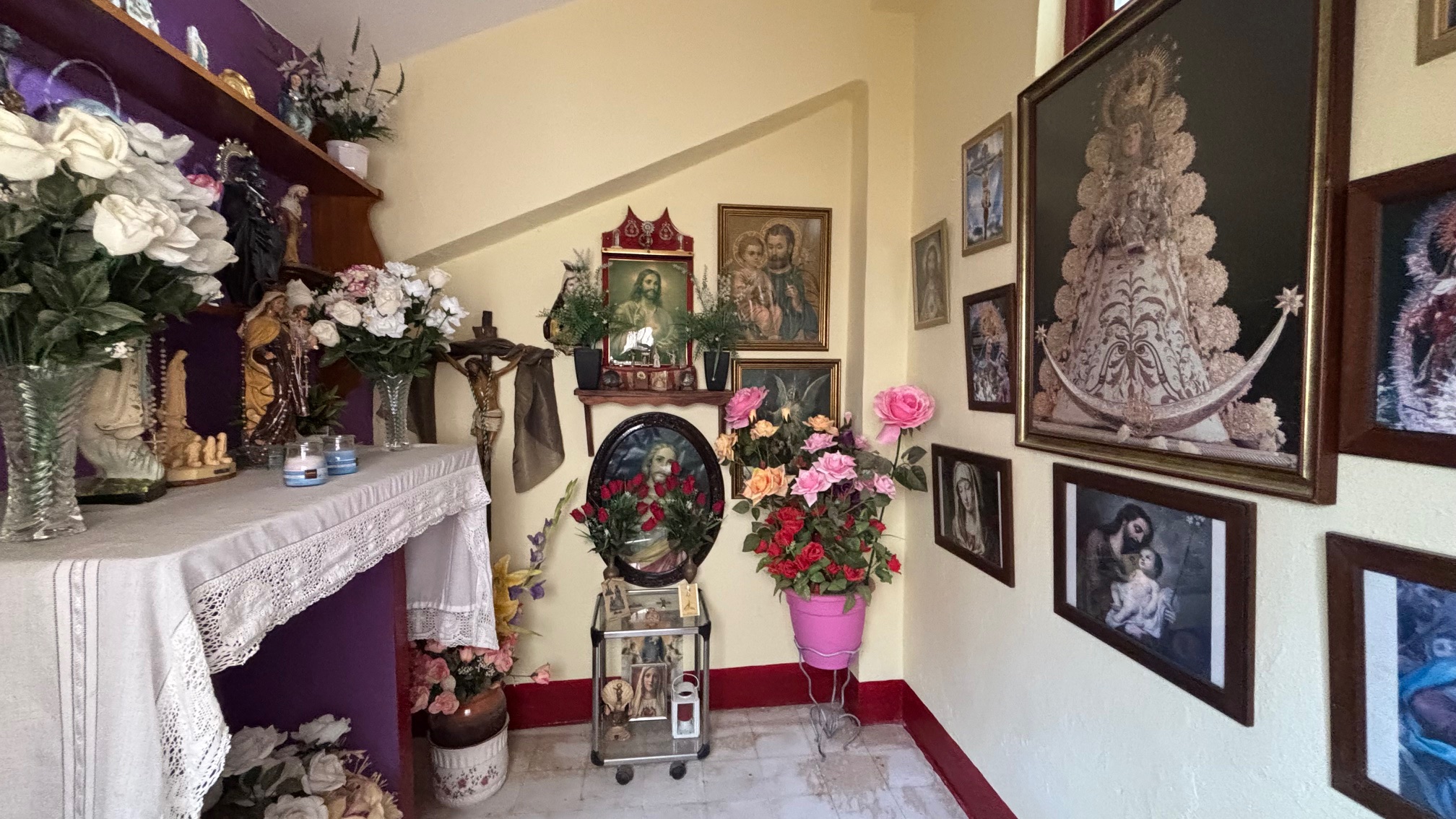 I den ene side står der en masse indrammede billeder stakket op langs væggen.