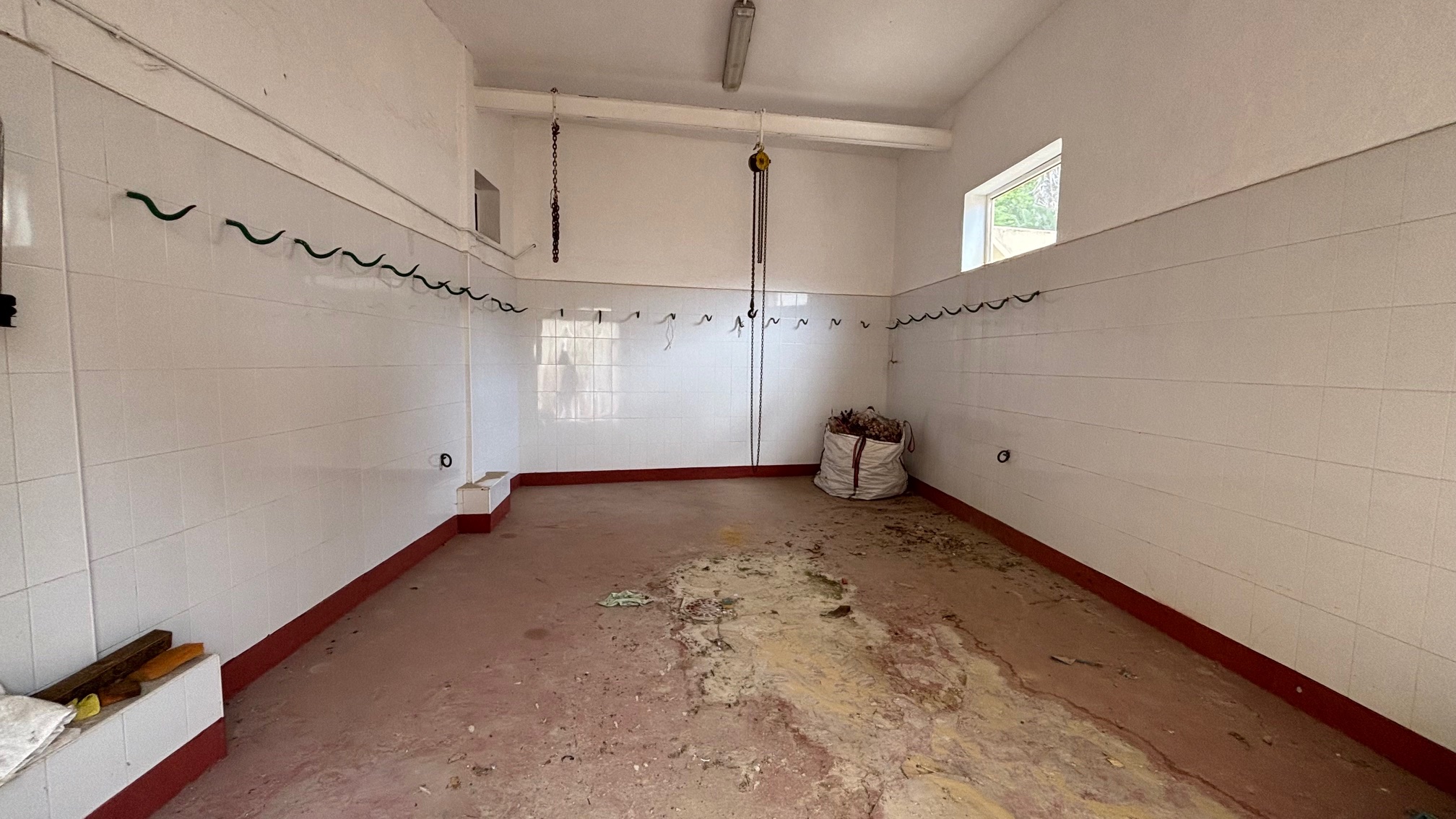 Vi går videre og står nu igen udenfor og ser på en ret stor dør med plastikstrimler hængende ned foran. Indenfor hænger der kødkroge på væggen og en enkelt krog i en lænke, der hænger fra et spil ned fra loftet.