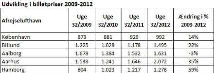 I løbet af de seneste tre år er priserne på billetter til de europæiske storbyer steget med hele 35 procent mod 14 procent i Københavns Lufthavne. Hertil kommer så, at priserne fra Jylland i forvejen lå 40 procent højere end hovedstadens.