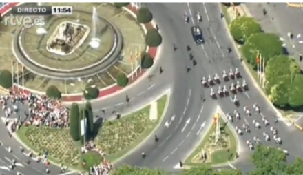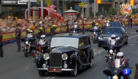 Kongen kører gennem Madrid til Kongressen. Det foregår i en særlig sikret Rolls Royce af hensyn til eventuelle risici