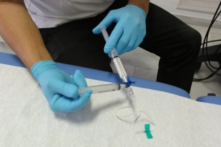 Vejledt af ultralyd indlægges en række små kanyler på benet. Dette kan gøres uden bedøvelse, idet det er mindre smertefuldt end at få taget en blodprøve eller få lagt en lokalbedøvelse.