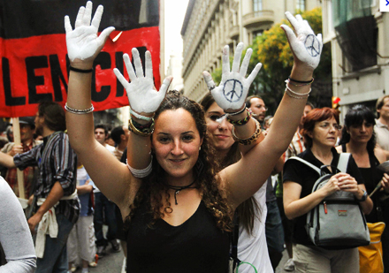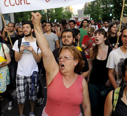 I Madrid samledes flere tusinde demonstranter sig i løbet af lørdagen på det centrale torv Puerta del Sol, der sidste år var skueplads for de omfattende protester mod den økonomiske politik og forringelse af borgernes rettigheder.