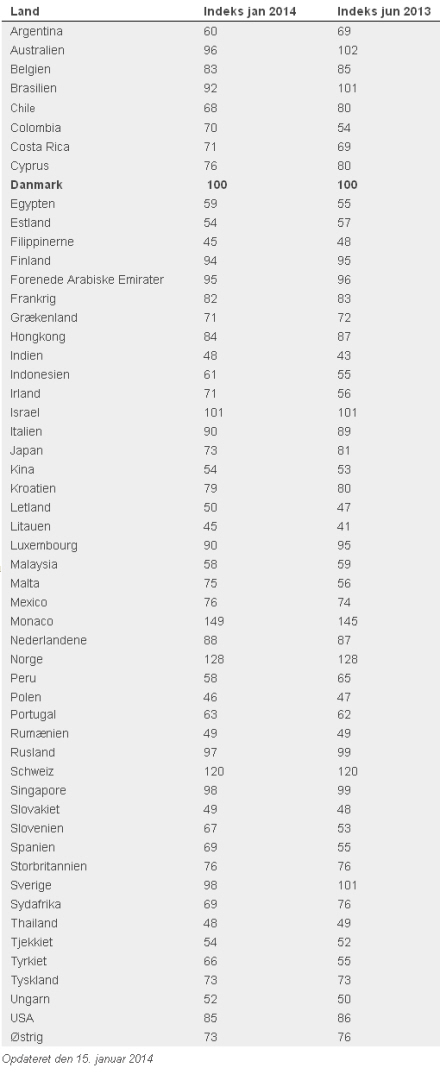 Det foregår på den måde, at Danmark har indeks 100, og i skemat nedenfor kan du se oversigten for de andre lande, som er med i undersøgelsen.
