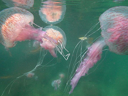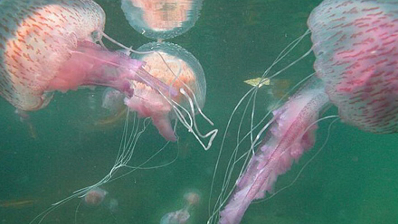 Goplen Pelagia noctiluca kan blive op til 30 cm i diameter og har stikkende og brændende nældeceller, som den almindelige røde brandmand, vi kender fra Danmark.