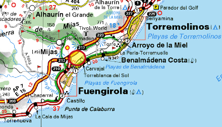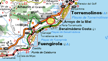 Fra strandpromenaden i Fuengirola kører vi ud på omfartsvejen og derefter ad motorvejen i retning mod Málaga. Vi tager den første afkørsel efter fem km., da vi er nået en højde på 205 meter over havet.