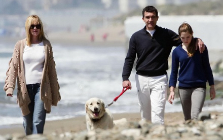 De to Hollywoodstjerner Melanie og Antonio lufter hund sammen med deres datter Stella (stjerne) på stranden i Marbella