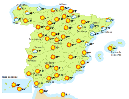I Madrid er det fortsat solrigt med 19 til 33 grader, mens det i Barcelona er overskyet med byger og 21 ti 27 grader. Valencia får letskyet vejr med mulighed for nogen nedbør hen under aften og 23 til 32 grader. I Málaga er der ikke meget andet at sige end sol, sol og sol med 24 til 36 grader.