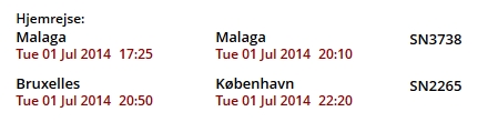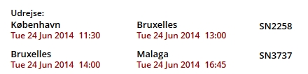 Brussels Airlines har en afgang fra Kastrup klokken 11:30. Mellemlanding i Bruxelles Airport, ophold i en time inklusive deboarding og boarding og ankomst til Málaga klokken 16:45.