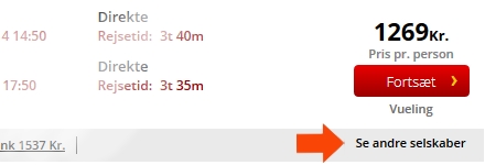 Hvis du trykker på 'Fortsæt' kommer du direkte til det rejseselskaber, der står under knappen (i dette tilfælde vueling). Du kan også klikke på 'Se andre selskaber'