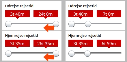 I dette tilfælde har jeg valgt, at min afrejse skal være tidligst klokken 9:00 og hjemrejsen senest klokken 20:00. Når du har flyttet de hvide knapper til de ønskede tidspunkter opdateres siden automatisk. Jo flere krav du stiller, desto færre muligheder bliver der naturligvis.