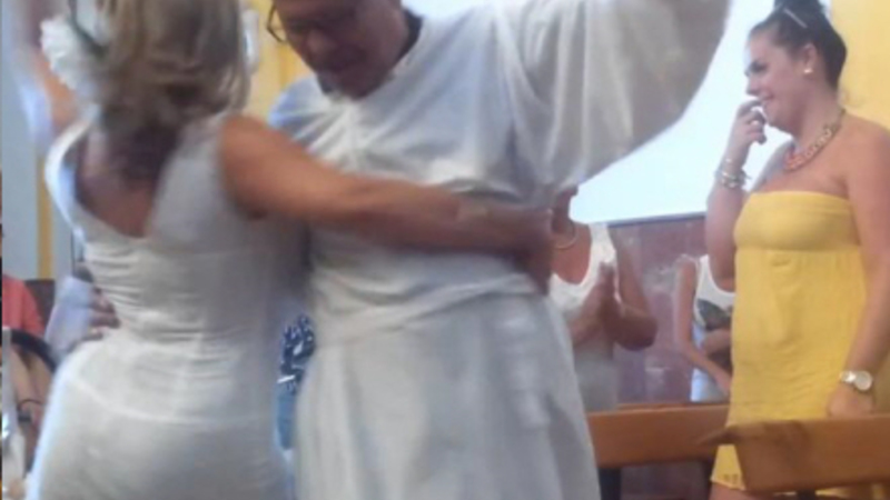 Den 66-årige præst danser en bestemt type flamengo-dans kaldet sevillanas. Kvindelige kirkegængere tager en dans med den katolske præst, som må løft lidt op i kjolen for at få det hele til at fungere.
