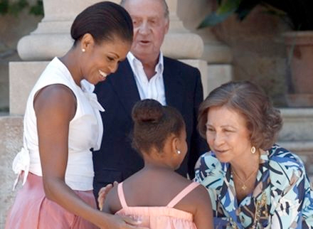 Dronning Sofia hilser på Michelle Obamas datter, Sasha, under familiens frokostbesøg hos det spanske kongepar på Mallorca efter ferien i Sydspanien