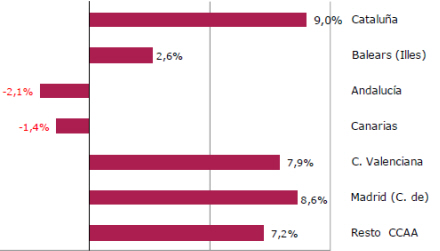 Den største fremgang finder vi i Catalonien, hvor der kom ni procent flere turister, Madrid steg med 8,6 og Valencia med 7,9 procent.