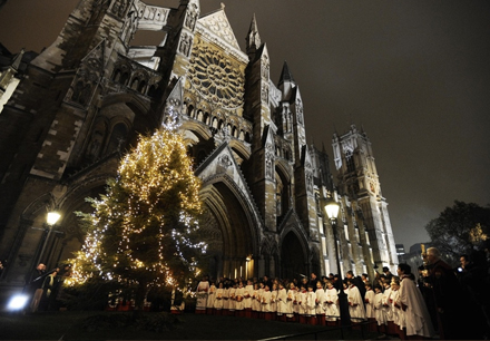 Julekor synger uden for Westminister Abbey i London