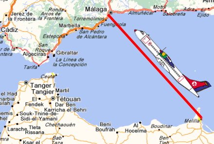 Flyet på ruten mellem Málaga og Melilla er en ATR72 med plads til 66 passagerer. Cruise-hastigheden er 500 km/t og flyvehøjden mellem syv og otte kilometer