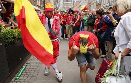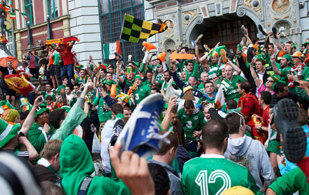 Spanske og irske fans... Læg mærke til, at der flyver sko til højre og venstre