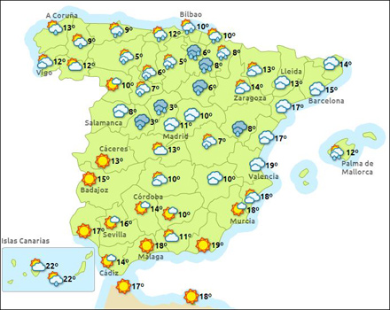 Madrid får i dag letskyet vejr med mellem fire – 12 grader, Barcelona skyet med nedbør og 10 – 15 grader, Valencia skyet med regn og mellem seks – 13 grader, og Málaga får solrigt vejr og mellem 11 - 18 grader.