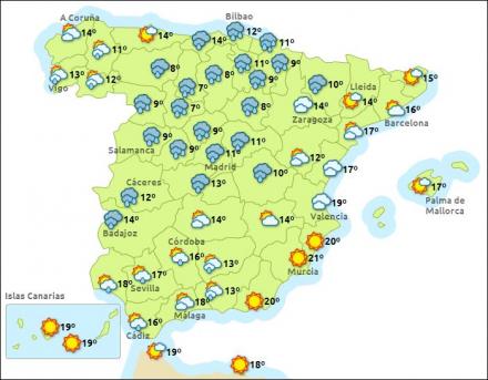 Madrid får skyet vejr med byger og ti til 12 grader, Barcelona får letskyet vejr med 11 til 18 grader, Valencia får skyet vejr og 10 til 16 grader og Màlaga får letskyet vejr med 11 til 18 grader.