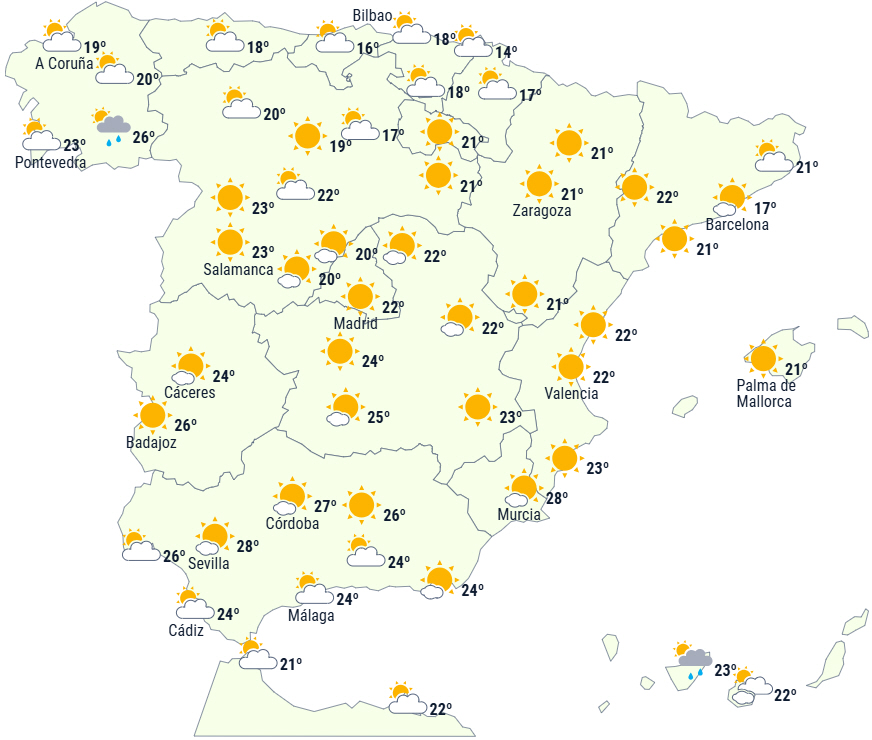 Dagstemperaturerne vil stige på De Baleariske Øer og hele Den Iberiske Halvø, bortset fra ved den cantabriske kyst, hvor de vil falde let. Uændrede temperaturer på De Kanariske Øer.