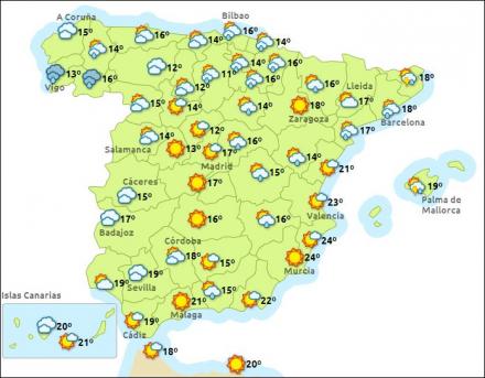 Fortsat ustadigt vejr, og der kommer en del regn i de nordlige egne, mens både Syd- og Østspanien går fri af det lavtryk, der i disse dage trænger ind fra vest.