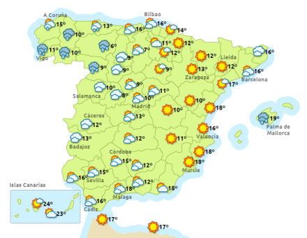 Vejret i Spanien, mandag klokken 14:00