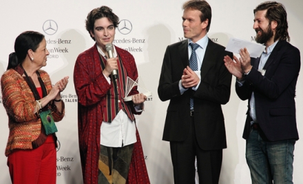 Den eftertragtede Mercedes-Benz Fashion Talent Award, gik til Ernesto Najanro for et design i kontrasterende materialer som neopren – der bruges til dykkerdragter - og gaze - syet oven på hinanden.