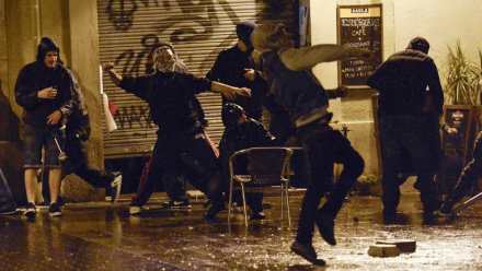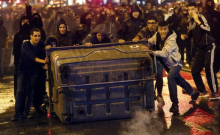 Demonstrationen i går var godt organiseret og forløb fredeligt, indtil en gruppe radikale unge begyndte at sætte ild til nogle containere. Da politiet slog hårdt ned, begyndte snesevis af demonstranter på at kaste med sten.