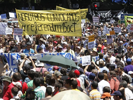 Initiativtagerne foreslår nemlig, at folkeafstemningen dels skal foregå over nettet og dels ved stemmeafgivelse på traditionel vis. Hjemmesiden http://www.referendum15deoctubre.org/ har i løbet af de seneste to dage haft haft mere end 57.000 besøg fra 15 forskellige lande.
