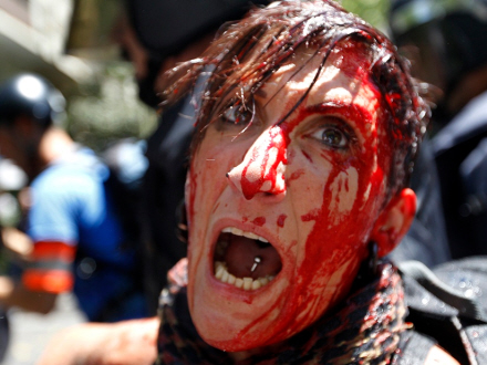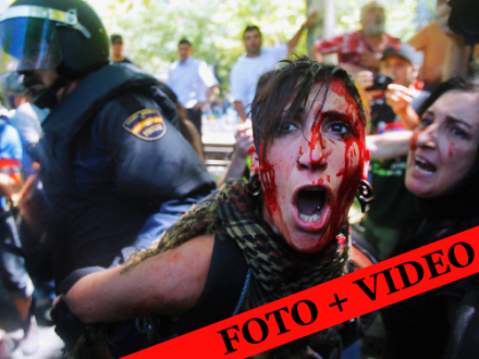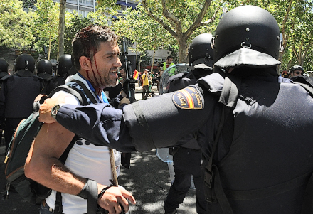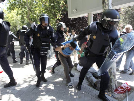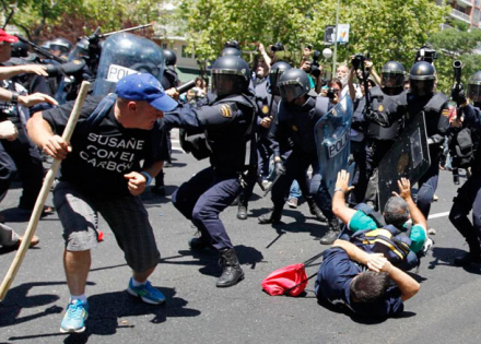 Nogle demonstranter kastede sten mod politiet og ild-skyts mod Indenrigsministeriets bygning i Madrid, hvorefter politiet svarede igen med gummikugler.