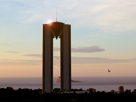 En af Europas højeste bygninger har kun elevator i bunden. Det lyder umiddelbart som en joke blandt arkitekter, men det er alligevel sagen i Intempo-bygningen i Benidorm, Alicante. En udvidelse fra 20 til 47 etager betyder, at elevatoren kun går til 20. sal.
