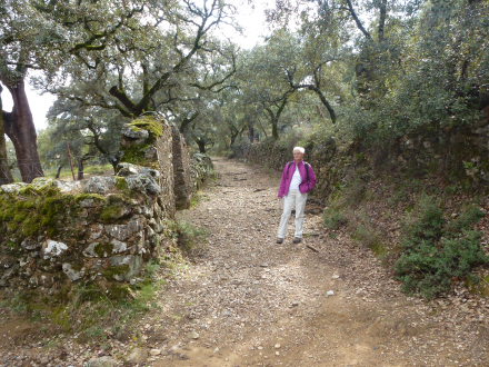 Stien går ud af Alájar i sydøstlig retning og går mellem stengærder med dehesas på begge sider. Her får man virkelig et indtryk af, at landskabet ikke har ændret sig i hundredvis af år. Stengærderne ser ud, som om de har stået der i århundreder og træerne det samme.